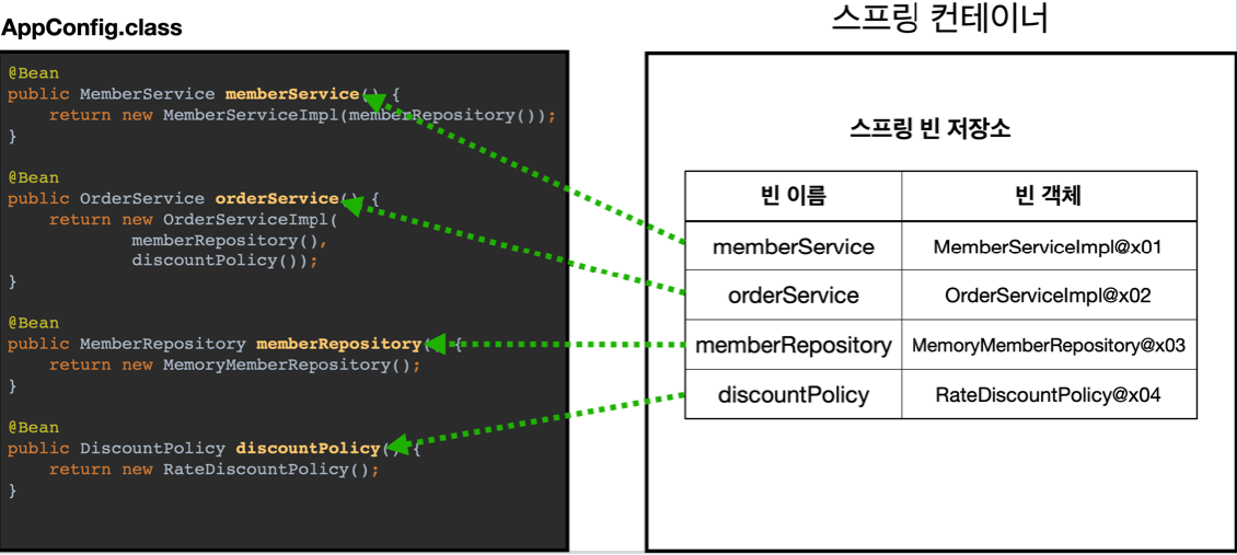 스프링 컨테이너는 @Configuration이 붙은 파일을 구성 정보로 사용하고, @Bean이 붙은 메서드를 호출해 반환된 객체를 스프링 컨테이너에 스프링 빈으로 등록합니다.