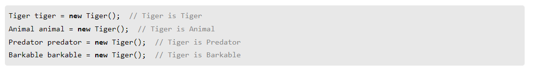 Tiger가 Animal 클래스를 상속받고(extends), Predator와 Barkable 인터페이스를 상속받는(implements)다면, 아래와 같이 Tiger 객체를 만들 수 있습니다.