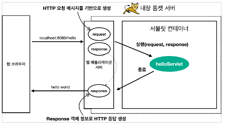 내장 톰캣 서버가 @WebServlet 어노테이션을 보고 서블릿 객체를 서블릿 컨테이너에 생성합니다.