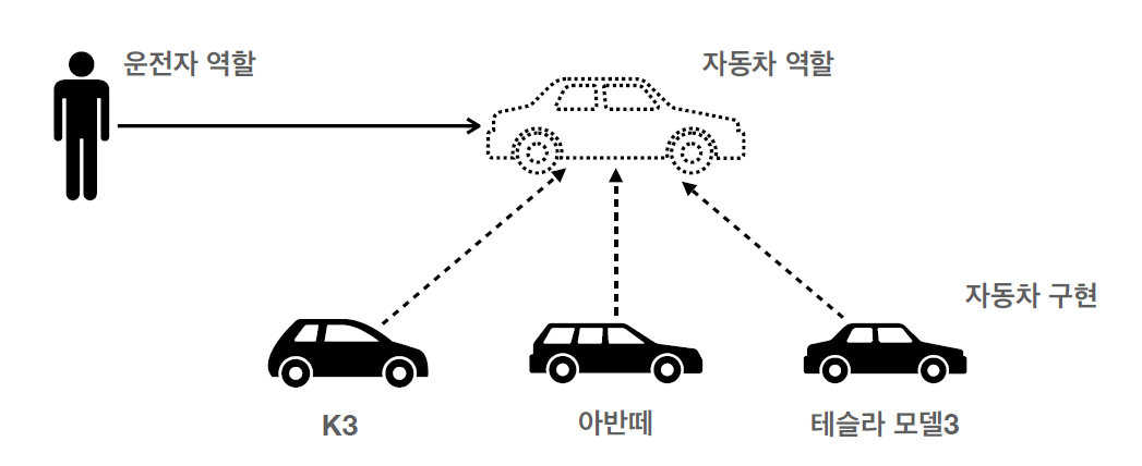 자동차 역할이 인터페이스이고, 자동차 구현이 구현체라고 생각해보면, 운전자는 K3나 아반떼가 전기차인 테슬라 모델3으로 바뀌어도 운전할 수 있습니다. 그런데 운전자 서비스 코드를 짤 때, K3에서 테슬라 모델 3으로 차량을 바꾸려고 하면 운전자 서비스 코드를 수정해야 할 것입니다! 예를 들어서 아래 코드처럼요.