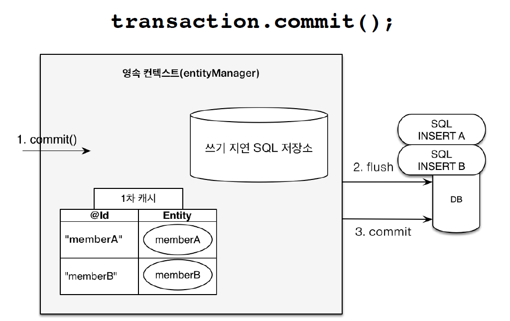 2. JPA는 트랜잭션을 커밋하는 순간 영속성 컨텍스트에 새로 저장된 엔티티를 데이터베이스에 반영하고, 이를 플러시(flush)라고 합니다. 플러시는 게시글의 후반부에서 자세히 다루겠습니다.