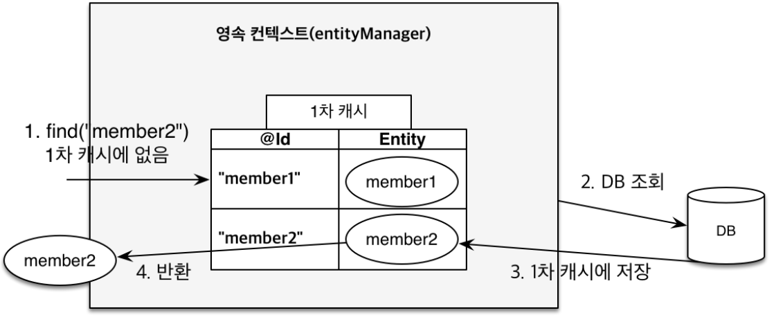 Member findMember2 = em.find(Member.class, "member2"); // DB에서 조회